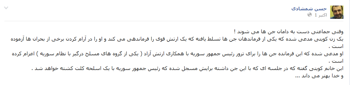به گزارش بولتن نیوز به نقل از رویداد، حسن شمشادی خبرنگار ایرانی مستقر در سوریه در صفحه فیس بوک خود از خرافه پرستی تکفیری ها برای ترور اسد پرده برداشت. یک زن کویتی مدعی شده که یکی از فرماندهان جن ها تسلط یافته که یک ارتش قوی را فرماندهی می کند و او را در آرام کردن برخی از بحران ها آزموده است .
