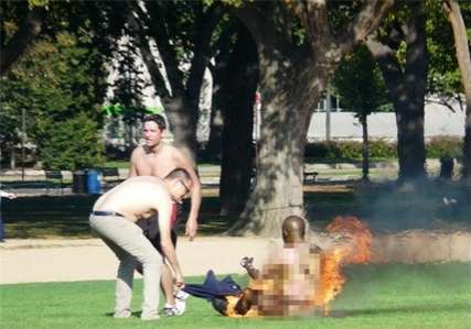 براساس اين گزارش، اين مرد سياهپوست عصر روز جمعه در پارك ملي مقابل كنگره آمريكا با ريختن بنزين اقدام به خودسوزي كرد كه پس از آن عابرين با استفاده از لباسهايشان اقدام به خاموش كردن آتش كردند.