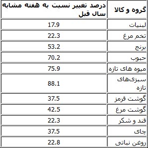براساس این گزارش متوسط قیمت خرده فروشی گروه لبنیات در هفته منتهی به سوم آبان ماه سال جاری نسبت به هفته مشابه سال قبل 17.9 درصد، تخم مرغ 22.3 درصد، گروه برنج 53.2 درصد، حبوبات 70.2 درصد، میوه های تازه 75.9 درصد، سبزی های تازه 88.1 درصد، گوشت قرمز 37.5 درصد، گوشت مرغ 42.5 درصد، قند و شکر 22.3 درصد، چای 37.5 درصد و روغن نباتی 22.8 درصد افزایش داشته است.