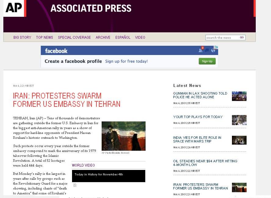 آسوشیتدپرس افزود:« دهها هزار نفر از مردم تهران با گردهمایی در اطراف سفارت سابق آمریکا، بزرگ ترین راهپیمایی ضد آمریکایی در سال های اخیر را برگزار کردند.»