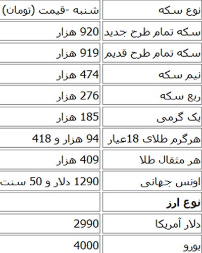 قیمت طلا ، سکه و ارز نسبت به هفته گذشته کاهش یافت.