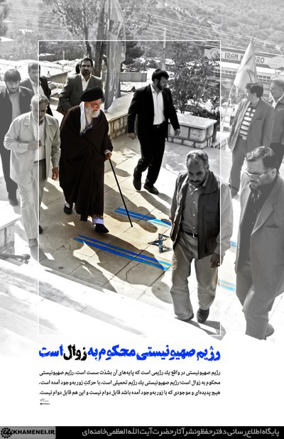 رهبر انقلاب: رژيم صهيونيستى در واقع يك رژيمى است كه پايههاى آن بشدّت سست است، رژيم صهيونيستى محكوم به زوال است؛ رژيم صهيونيستى يك رژيم تحميلى است، با حركتِ زور بهوجود آمده است، هيچ پديدهاى و موجودى كه با زور بهوجود آمده باشد قابل دوام نيست و اين هم قابل دوام نيست.