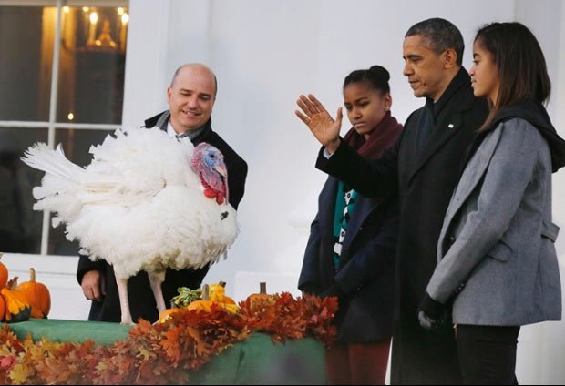 اوباما به همراه دو دخترش ساشا و مالیا مراسم عفو بوقلمون را در حیاط کاخ سفید اجرا کردند.