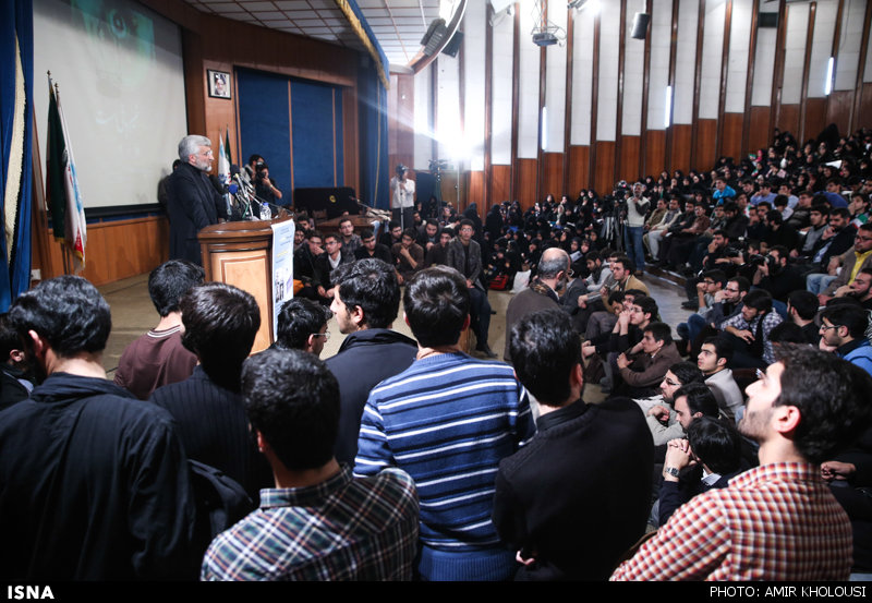 بعد از شعارهای دانشجویان در استقبال از جلیلی وی کنار محمد حسین صفار هرندی نشست و دقایقی بعد زمانی که کلیپی در معرفی بیشتر جلیلی به دانشجویان پخش شد، سالن شهید چمران و حال و هوای دانشجویان حاضر در آن بیش از پیش دیدنی بود، جمعیتی که این بار همه ایستاده بود و با تشویق های ممتد خود، آماده سخنرانی «دیپلمات انقلابی» می شد.