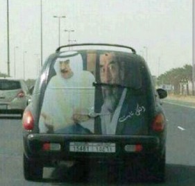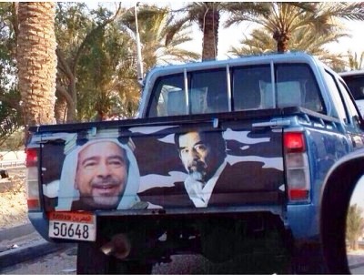 به گزارش خبرگزاری مهر به نقل از خبرگزاری عراقی براثا، تصاویری از خودروهای حامیان رژیم آل خلیفه در خیابانهای منامه منتشر شده است که تصویر نخست وزیر رژیم بحرین در کنار تصویری از صدام معدوم بر روی این خودروها دیده می شود.