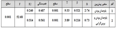 در ادامه بهمنظور بررسي اينکه چه مقدار از واريانس آخرتنگري بهوسيله ويژگيهاي شخصيتي تبيين ميشود، از روش رگرسيون گام به گام استفاده شد. جدول 3 نتايج مدل رگرسيون پنج عامل شخصيت را بر آخرتنگري کل نشان ميدهد. نتايج حاصل از مدل رگرسيوني نشان داد که آمارة F محاسبه شده براي مدل رگرسيوني (F=52/68) در سطح P< 0/001 معنادار است. براساس اين جدول، از ميان پنج ويژگي شخصيتي دو بعد با وجدان بودن و برونگرايي، در دو گام حدود 31 درصد از واريانس آخرتنگري را تبيين ميکنند. با توجه به نتايج اين جدول، در گام اول عامل با وجدان بودن كه بيشترين ضريب همبستگي جزئي معنادار را با آخرتنگري دارد، وارد مدل شده و حدود 24 درصد از تغييرات آخرتنگري را پيشبيني ميكند. در گام دوم، با وارد شدن عامل برونگرايي، اين پيشبيني به 31 درصد افزايش يافته است. ساير عوامل به علت نداشتن همبستگي جزئي معنادار وارد مدل نشدهاند.