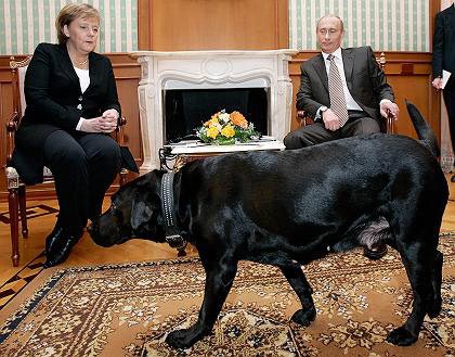 پوتین که در بیشتر سفرهای خود سگش کانی را نیز همراه میبرد، چند وقت پیش و در جریان دیدارش با مرکل، اين سگ را کنار پاي مرکل نشاند و موجب ناراحتي وي شد پوتين سگ را از کنار مرکل راند و با طعنه به او گفت: "فکر نميکردم سگ شما را بترساند. او کار بدي نميکند و خبرنگاران را دوست دارد."