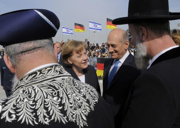 در روز 16 مارس سال 2008، مرکل برای بزرگداشت شصتامین سالگرد تاسیس رژیم صهیونیستی (اسرائیل)، وارد سرزمين هاي اشغالي شد. وی در فرودگاه از سوی ایهود اولمرت، بسیاری از رهبران سیاسی و مذهبی و کابینه اسرائیل مورد استقبال رسمی قرار گرفت. پیش از این، تنها جرج بوش بود که چنین استقبالی از وی به عمل آمده بود. در آن دوران مرکل به صورت عجیب و بحثانگیزی همزمان رئیس اتحادیه اروپا و گروه جی8 شده بود. البته در سال 2007 نیز دانشگاه عبری اورشلیم به وی دکترای افتخاری اعطا کرده بود. در سال 2010 موسسه تحقیقاتی "لئو بائک" که در نیویورک واقع بوده و وقف تاریخ یهودیان آلمانیزبان شده است، به آنگلا مرکل نشان "لئو بائک" اعطا نمود. این جایزه توسط وزیر پیشین خزانهداری آمریکا و رئیس کنونی موزه یهودی برلین، مایکل بلومنتال به مرکل داده شد. بلومنتال در مراس اعطا از تلاشهای فراوان مرکل در جهت حمایت از حیات فرهنگی یهودیان تقدیر نمود.