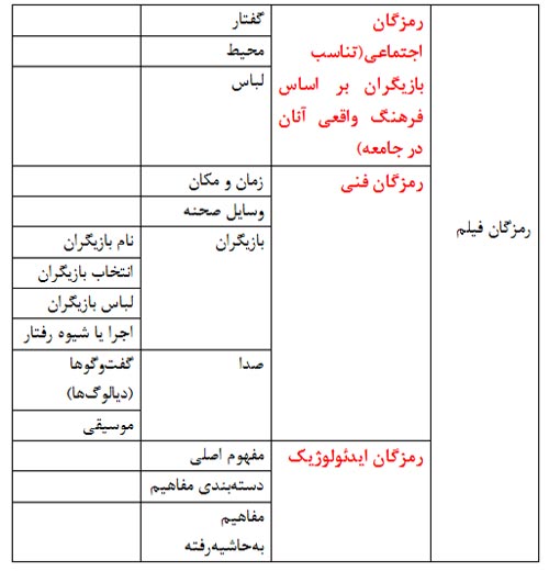 جدول 3 (عناصر تحليل رمزگان جان فيسك) (اسماعيلي، 1392، ص 132)