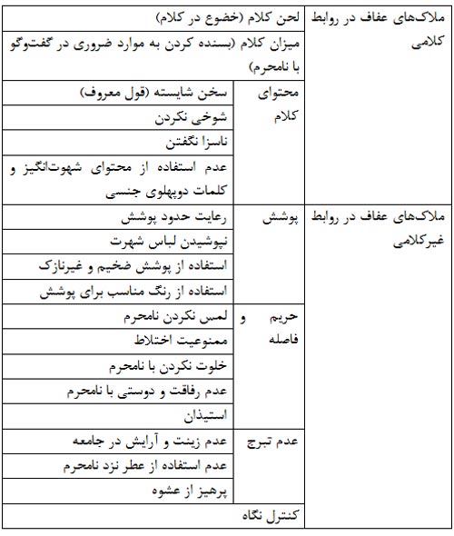 جدول (1) ملاكهاي عفاف و حيا در روابط زن و مرد ( طبق آیات و روایات)