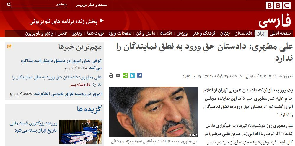به گزارش جام نیوز، سایت بی بی سی(BBC)، روز دوشنبه 19 تیر(July 09) نوشت: «یک روز بعد از آن که دادستان عمومی تهران از اعلام جرم علیه علی مطهری خبر داد، این نماینده مجلس ایران گفت که "دادستان حق ورود به نطق نمایندگان را ندارد." علی مطهری روز دوشنبه، 19 تیرماه به خبرگزاری فارس گفت: "اگر توهین یا افترایی (در صحن علنی مجلس) در کار باشد، فرد توهینشونده حق دفاع از خود در صحن مجلس را دارد. طبق اصول 84 و 86 قانون اساسی، نماینده در اظهارنظر درباره همه مسائل کشور آزاد است و نباید چماقی به نام دادستان بالای سر او باشد."»