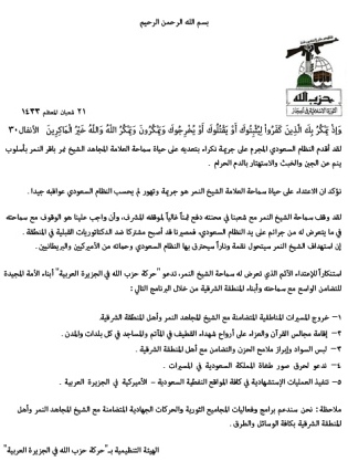 به گزارش شیعه آنلاین، جنبش حزب الله شبه جزیره العرب موسوم به "حزب الله حجاز" با انتشار بیانیه ای رسمی، ضمن محکوم کردن ترور آیت الله النمر توسط نیروهای امنیتی رژیم آل سعود، تهدید کردند که در آینده ای نزدیک چاه های نفت عربستان سعودی را مورد حمله قرار خواهند داد.
