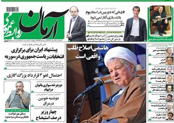 بولتن نیوز: هنوز زمان زیادی از انتشار گزارش 26 تیرماه بولتن نیوز با تیتر "تست هاشمي رفسنجاني براي رييس جمهور شدن" نمی گذرد که باز هم امروز، روزنامه آرمان تیتر و عکس روی پیشخوان خود را به ایشان اختصاص داد تا یک مورد دیگر به پالسهایی که آقای هاشمی در این راستا میفرستد که به شخصه می خواهد به عنوان کاندیدا وارد عرصه انتخابات شود، اضافه شود.