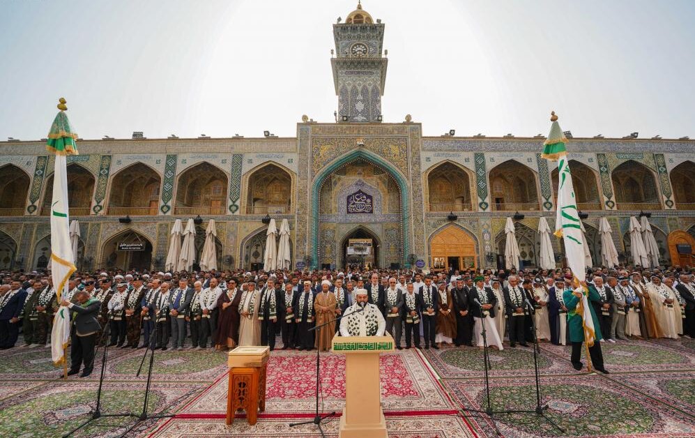 الخرسان، به همراه خادمانی از هیئت مدیره این آستان، پرچم بیعت و وفاداری با امیرالمؤمنین (ع) را برافراشتند و آغاز مراسم هفته جهانی غدیر را اعلام کردند.