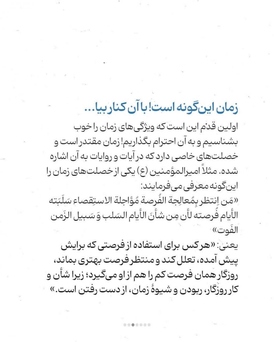 اولین قدم این است که ویژگی های زمان را خوب بشناسیم و به آن احترام بگذاریم! زمان مقتدر است و خصلت های خاصی دارد که در آیات و روایات به آن اشاره شده است.