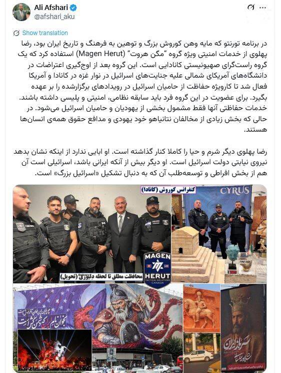 علی افشاری از فعالان رسانه در خارج از کشور درباره این مسئله در شبکه ایکس نوشته است: در برنامه تورنتو که مایه وهن و توهین به فرهنگ و تاریخ ایران بود، رضا پهلوی از خدمات امنیتی ویژه گروه “مگن هروت” (Magen Herut) استفاده کرد که یک گروه راستگرای صهیونیستی کانادایی است.