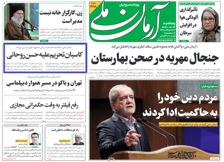 روزنامه آرمان در یکی از تیترهای صفحه نخست شماره امروز خود منتقدان سخنرانی ضدملی حسن روحانی را «کاسبان تحریم» نامیده است!