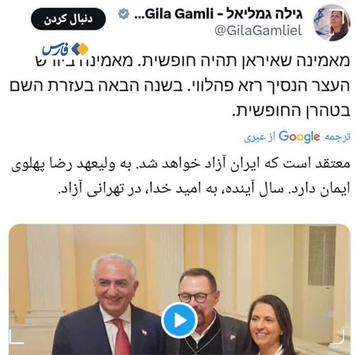 گیلا گاملیل، وزیر سابق اطلاعات رژیمصهیونی و وزیر فعلی فناوری این رژیم جعلی در توییتی با انتشار تصویر رضا پهلوی کنار خود نوشت: معتقدم که ایران آزاد خواهد شد، به ولیعهدی رضا پهلوی ایمان دارم، سال آینده به امید خدا در تهرانی آزاد !»