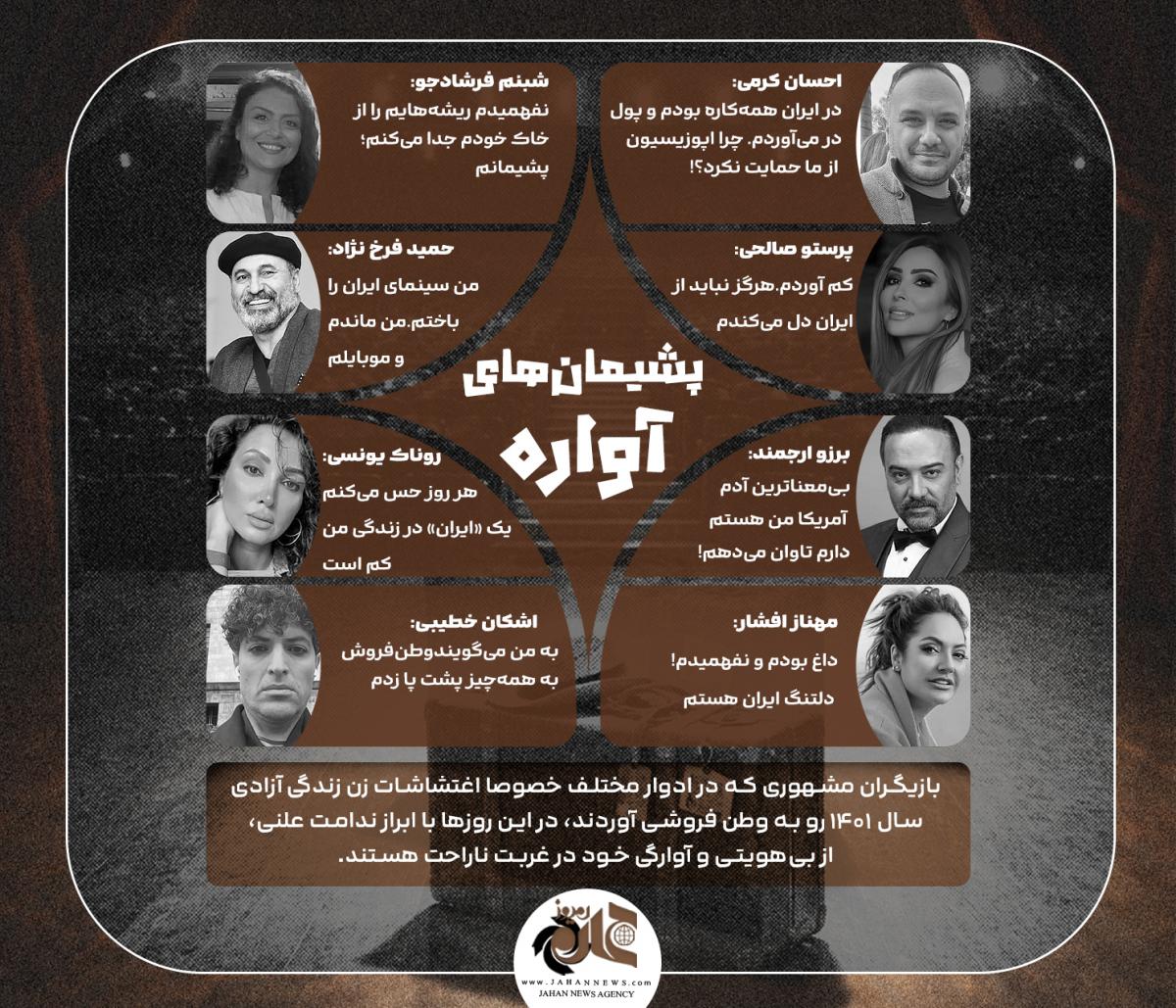 بازیگران مشهوری که در ادوار مختلف خصوصا اغتشاشات زن زندگی آزادی سال 1401 رو به وطن فروشی آوردند، در این روزها با ابراز ندامت علنی، از بیهویتی و آوارگی خود در غربت ناراحت هستند.