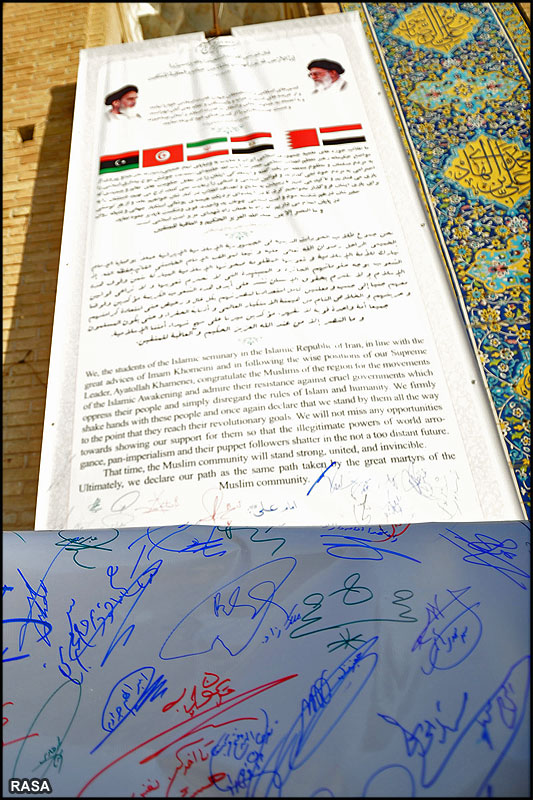 لازم به ذکر است، در متن این طومار آمده است: ما طلاب حوزههای علمیه جمهوری اسلامی ایران با عنایت به وصایای امام خمینی(ره) و پیروی از مواضع حکیمانه رهبر معظم انقلاب اسلامی حضرت آیتالله خامنهای جوشش بیداری اسلامی را به مردم مسلمان و مظلوم منطقه تبریک گفته و ایستادگی ایشان را در مقابل حکومتهای ظالم و مستبدی که احترامی به مردم خود نمیگذارند و قوانین اسلامی و انسانی را رعایت نمیکنند ارج مینهیم، دستشان را به یاری میفشاریم و تاکید میکنیم تا رسیدن به نتایج و اهداف انقلاب در کنارشان خواهیم ماند و از هر کوششی برای یاری ایشان فرو گذار نخواهیم کرد. تا در آیندهای نزدیک هیمنه پوشالی استکبار جهانی و دنبال روان حقیرشان درهم شکسته شود و امت اسلامی چونان ید واحد، قوی و شکست ناپذیر جلوه نماید.