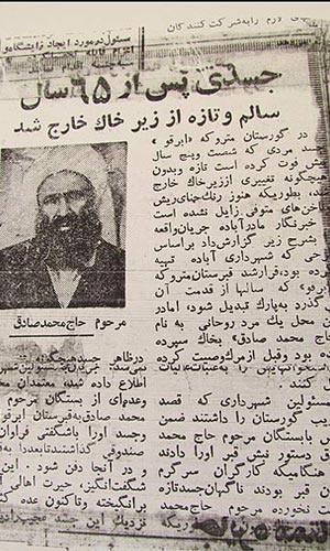 این روزنامه نوشت: [در گورستان متروکه ابرقو جسد مردی که ۶۵ سال پیش فوت کرده است تازه و بدون هیچگونه تغییری از زیر خاک خارج شد، به طوریکه هنوز رنگ حنای ریش و ناخن های متوفی زایل نشده است. خبرنگار ما در آباده جریان واقعه را به شرح زیر گزارش داد: بر اساس طرحی که شهرداری آباده تهیه کرده بود،قرار شد قبرستان متروکه ابرقو که سالها از قدمت آن می گذرد به پارک تبدیل شود، اما در این محل یک مرد روحانی به نام حاج محمد صادق به خاک سپرده شده بود و قبل از مرگ وصیت کرده بود استخوانهایش را به عتبات عالیات حمل کنند.