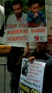علاوه بر این، معترضین آمریکایی تصاویری از شهید احمدی روشن و فرزند خردسال او همراه داشتند و آنگونه که از پخش زنده این تظاهرات بر روی اینترنت مشخص بود، یکی از ایرانیان مقیم آمریکا با اشاره به این تصویر بیان میکرد که آمریکا برای جلوگیری از برنامه هستهای ایران، دانشمندان این کشور را ترور میکند.