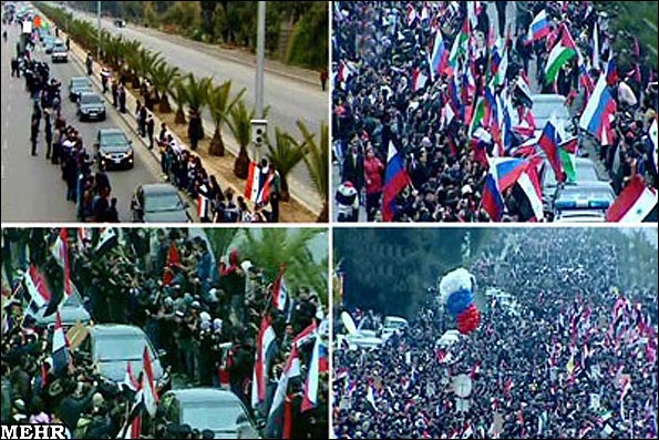 این خبرگزاری افزود جمعیت زیادی از قشرهای مختلف مردم سوریه برای تقدیر از وزیر امور خارجه روسیه به سبب مواضع این کشور در حمایت از ملت و دولت سوریه و برنامه اصلاحات به رهبری بشار اسد، در منطقه المزه و مسیر عبور لاوروف تجمع کردند.