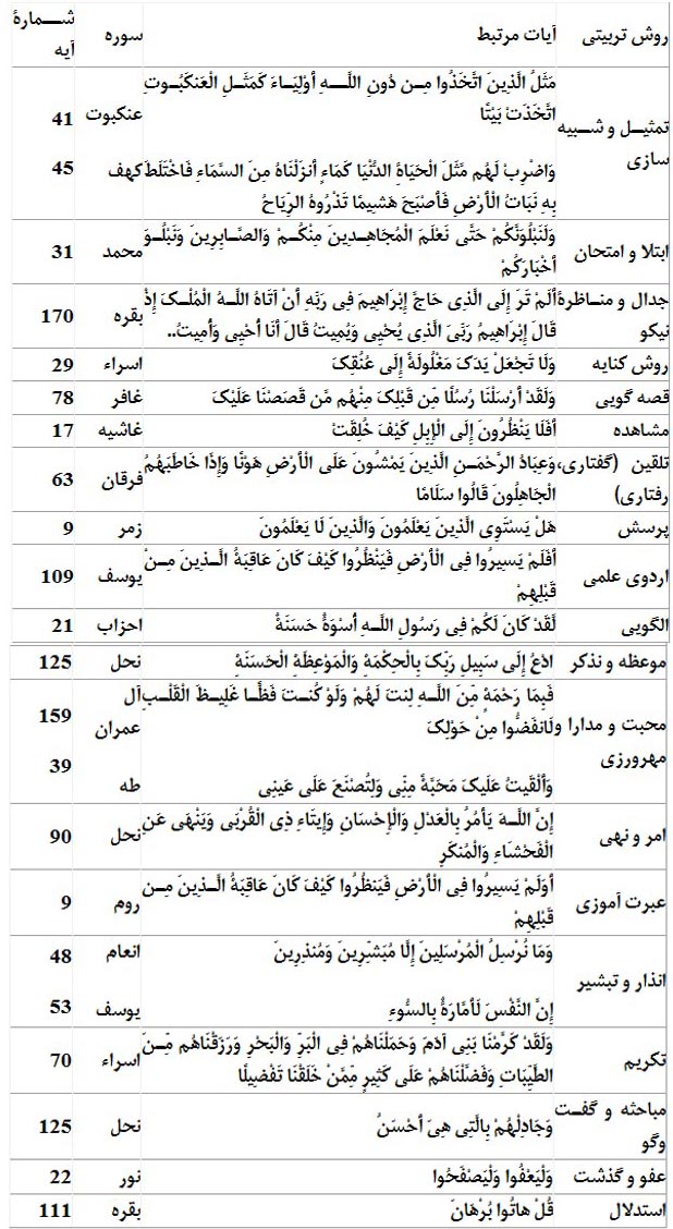 جدول شمارة 4. مصداق هايي از روش هاي تربيت در قرآن