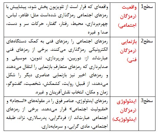جدول 3 (عناصر تحليل رمزگان جان فيسك) (اسماعيلي، 1392، ص 132)