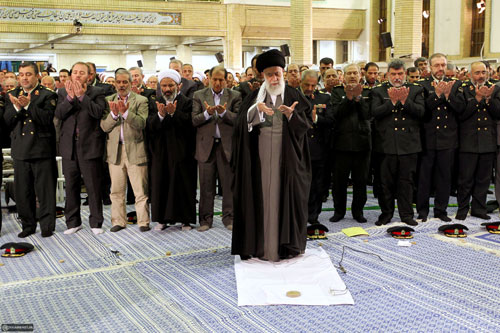 یکی از فرماندهان همه حضار را برای تشریف فرمایی حضرت آقا آماده می کنند " برادران محترم لطفا آماده باشند " حاضران کم کم به پا خواسته و منتظر آقا می ایستند . آقا وارد میشوند . فرمانده "خبر دار" حالا همه دست گرفته و نظم شوق انگیزی چشم نواز شده و آقا در پاسخ به فرماندهی میدان آزاد باش می دهند و با ذکر صلوات همه آماده اقامه نماز می شوند .