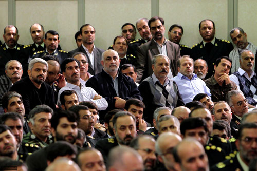 فرماندهان ارشد نیرو عاشقانه اطراف جایگاه آقا حلقه زده اند و آقا با تبسمی روح نواز به ابراز احساسات آنان و جانبازان و روحانیونی که در جلسه حضور دارند پاسخ می دهند و در ادامه و طی سخنانی کوتاه از زحمات بی دریغ آنان در تامین امنیت مردم قدردانی نموده و آنان را نسبت به وظیفه خطیری که بر عهده دارند بیش از پیش آگاه می کنند.