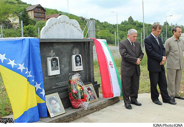 ادای احترام به یادبود شهید رسول حیدری در بوسنی که در محل شهادت توسط مردم بوسنی ساخته شده است
