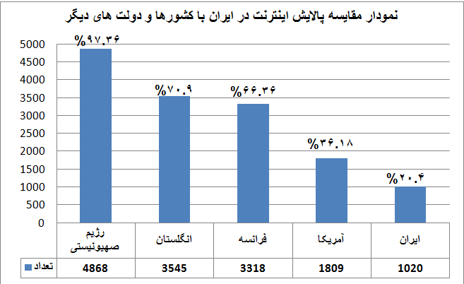 و اما در ایران بررسی ها نشان می دهد به همان نسبت فوق، تنها ۱۰۲۰ تارنما، پالایش شده است که ۹۹.۷% موارد نیز به دلیل انتشار محتوای مستهجن پالایش شده اند و این نسبت در قیاس با سه کشور و یک رژیم فوق بسیار پایین تر است.