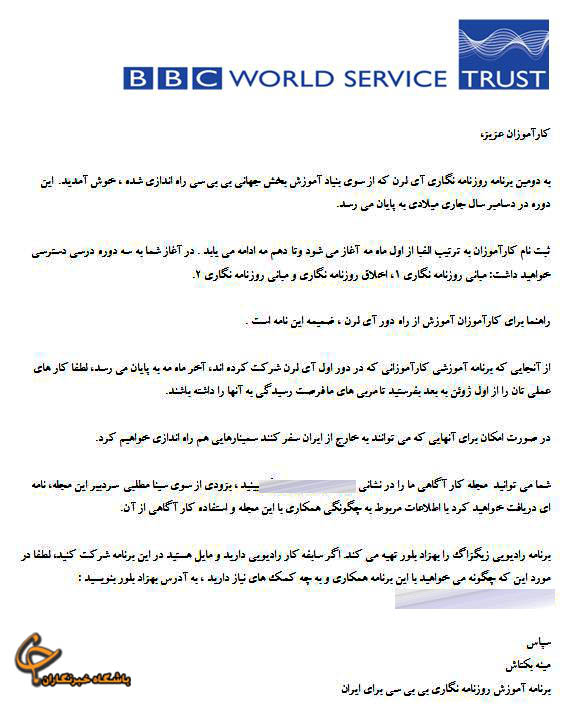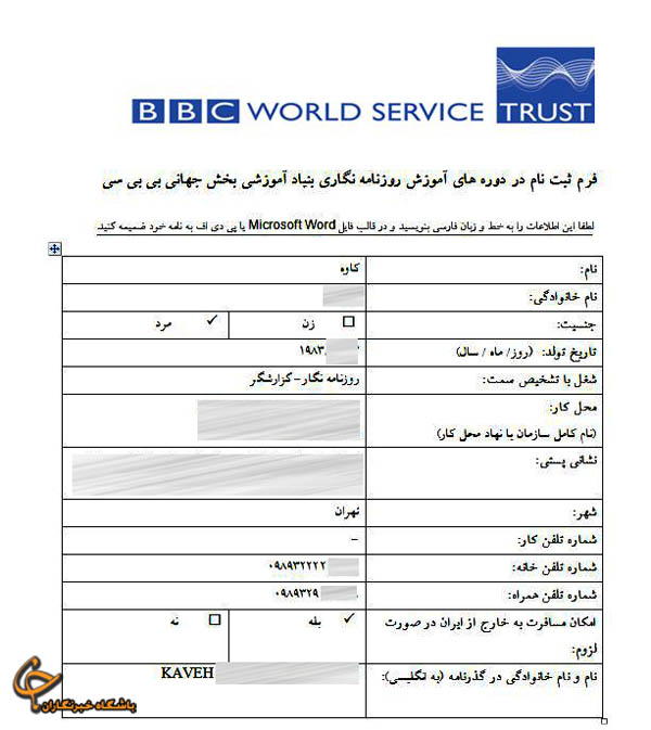 فرم ارسال شده از سوي بي بي سي براي کارآموزان