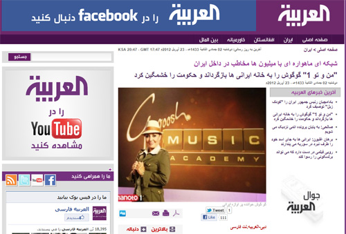 به گزارش ندای انقلاب ،العربیه با معرفی برخی برنامه های این شبکه ضد اخلاق مدعی شده که به دلیل اینکه این شبکه گوگوش(خواننده هرزه و بدکاره دوران طاغوت که هم اکنون بالای ۷۰ سال سن دارد) ار به خانه ایرانیان آورده حکومت با این شبکه مخالف است.! البته ظاهرا هنوز برای اعراب صهیونیست شبکه اعربیه جذابیت دارد که اینچنین از این شبکه بهایی حمایت می کنند!