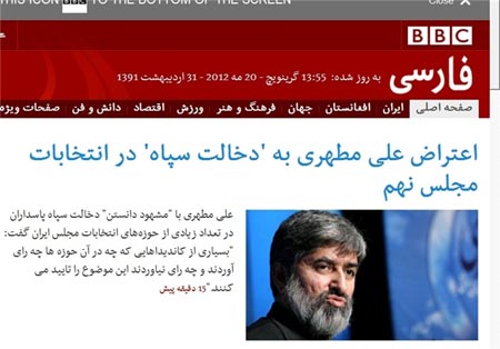 بیبیسی فارسی رسانه وابسته به رژیم سلطنتی انگلیس خبر اول خود را به نطق علی مطهری اختصاص داد و با انتخاب تیتر "اعتراض علی مطهری به 'دخالت سپاه' در انتخابات مجلس نهم" نوشت: "علی مطهری، نماینده تهران در مجلس ایران با "مشهود دانستن" دخالت سپاه پاسداران در تعداد زیادی از حوزههای انتخابات مجلس گفت: "بسیاری از کاندیداهایی که چه در آن حوزه ها چه رای آوردند و چه رای نیاوردند این موضوع را تایید میکنند."