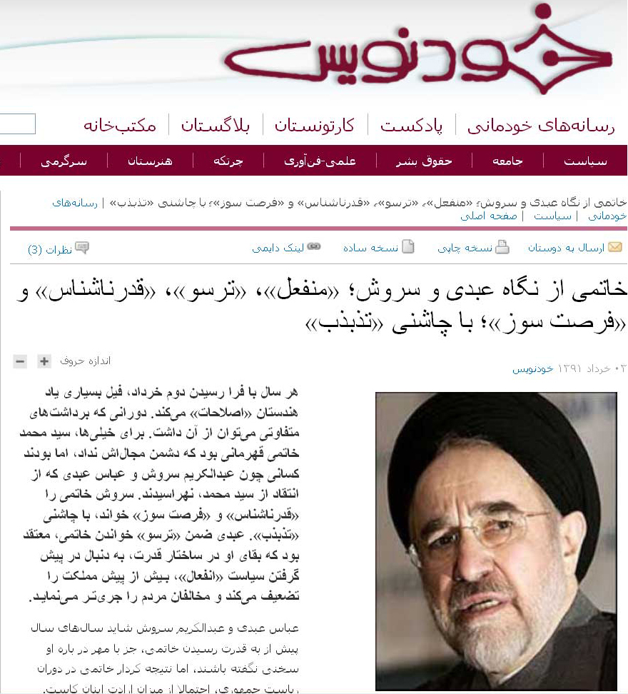 سایت خودنویس چهارشنبه3 خرداد (May.23) نوشت: «هر سال با فرا رسیدن دوم خرداد، فیل بسیاری یاد هندستان "اصلاحات" میکند. دورانی که برداشتهای متفاوتی میتوان از آن داشت. برای خیلیها، سید محمد خاتمی قهرمانی بود که دشمن مجالاش نداد، اما بودند کسانی چون عبدالکریم سروش و عباس عبدی که از انتقاد از سید محمد، نهراسیدند. سروش خاتمی را "قدرناشناس" و "فرصت سوز" خواند، با چاشنی "تذبذب". عبدی ضمن "ترسو" خواندن خاتمی، معتقد بود که بقای او در ساختار قدرت، به دنبال در پیش گرفتن سیاست "انفعال"، بـیش از پیش مملکت را تضعیف میکند و مخالفان مردم را جریتـر مـینمایـد.»