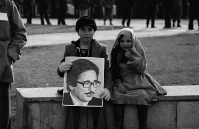 دو کودک که برای تبلیغ نامزدی بنیصدر در اولین انتخابات ریاست جمهوری اسلامی ایران، عکسی از وی در دست دارند
